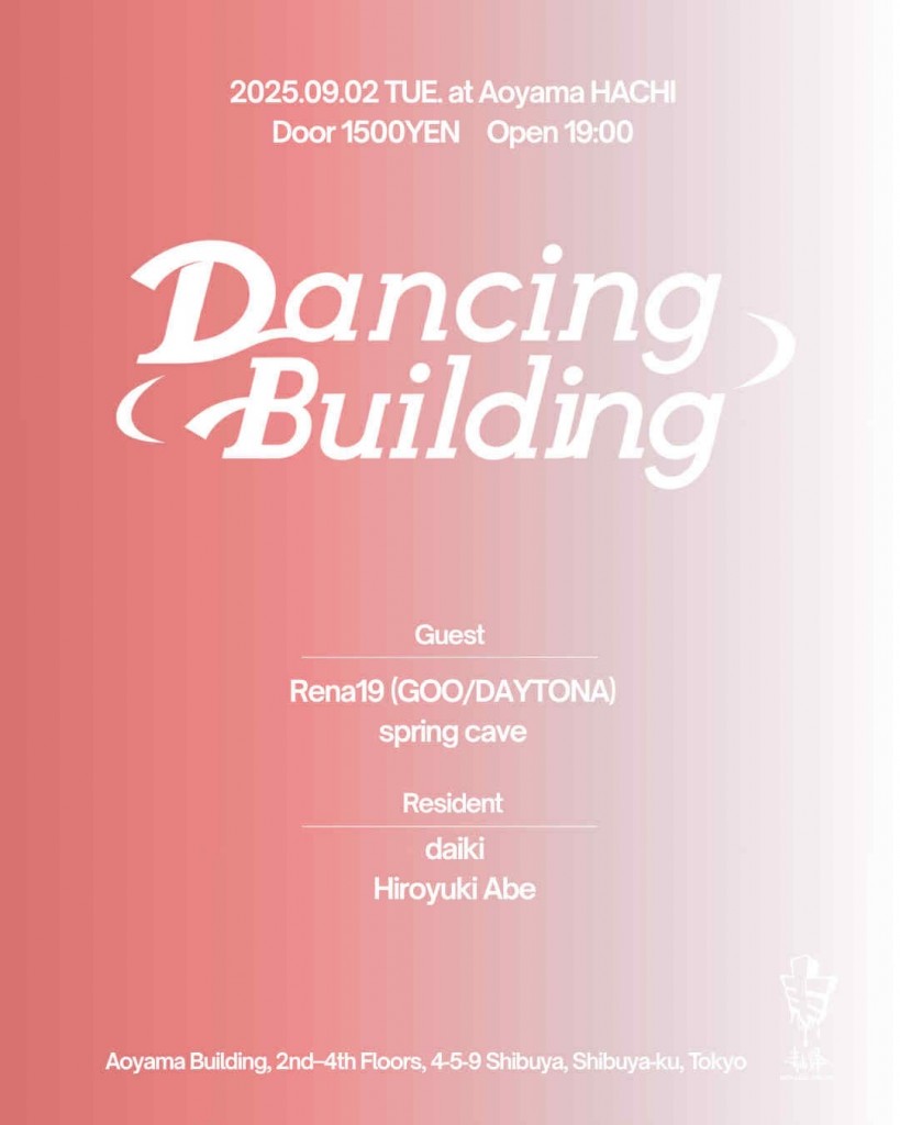2025.09.02 Tue Dancing Building Dancing Building HOUSE DATE: 2025.09.02 Tue 19:00 DOOR: ¥1500 ■GUEST DJ Rena19 (GOO/DAYTONA) spring cave ■RESIDENT DJ daiki Hiroyuki Ave
