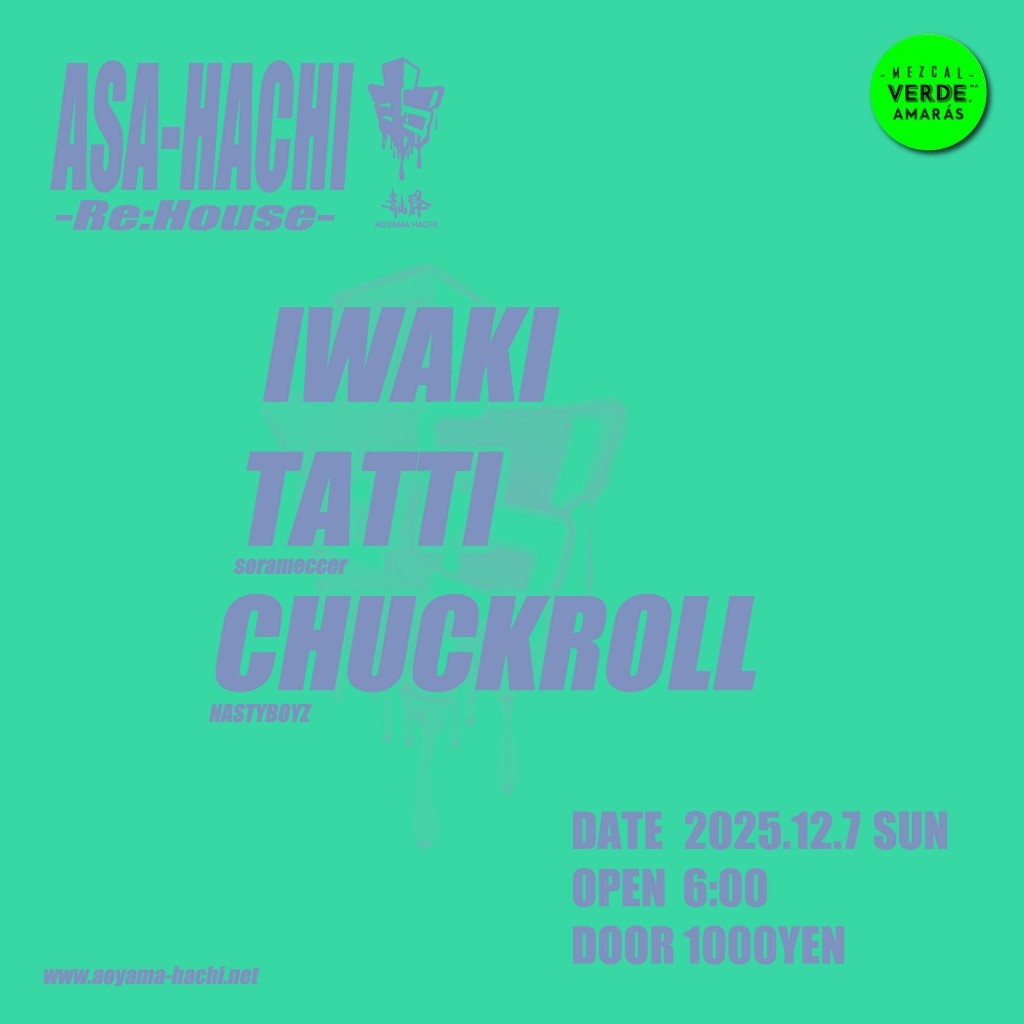 2025.12.07 Sun Asa-Hachi -Re:House- Asa-Hachi -Re:House- HOUSETECHNO DATE: 2025.12.07 Sun 06:00 DOOR: ¥1000 ■RESIDENT DJ IWAKI TATTI (sorameccer) CHUCKROLL (NASTYBOYZ)