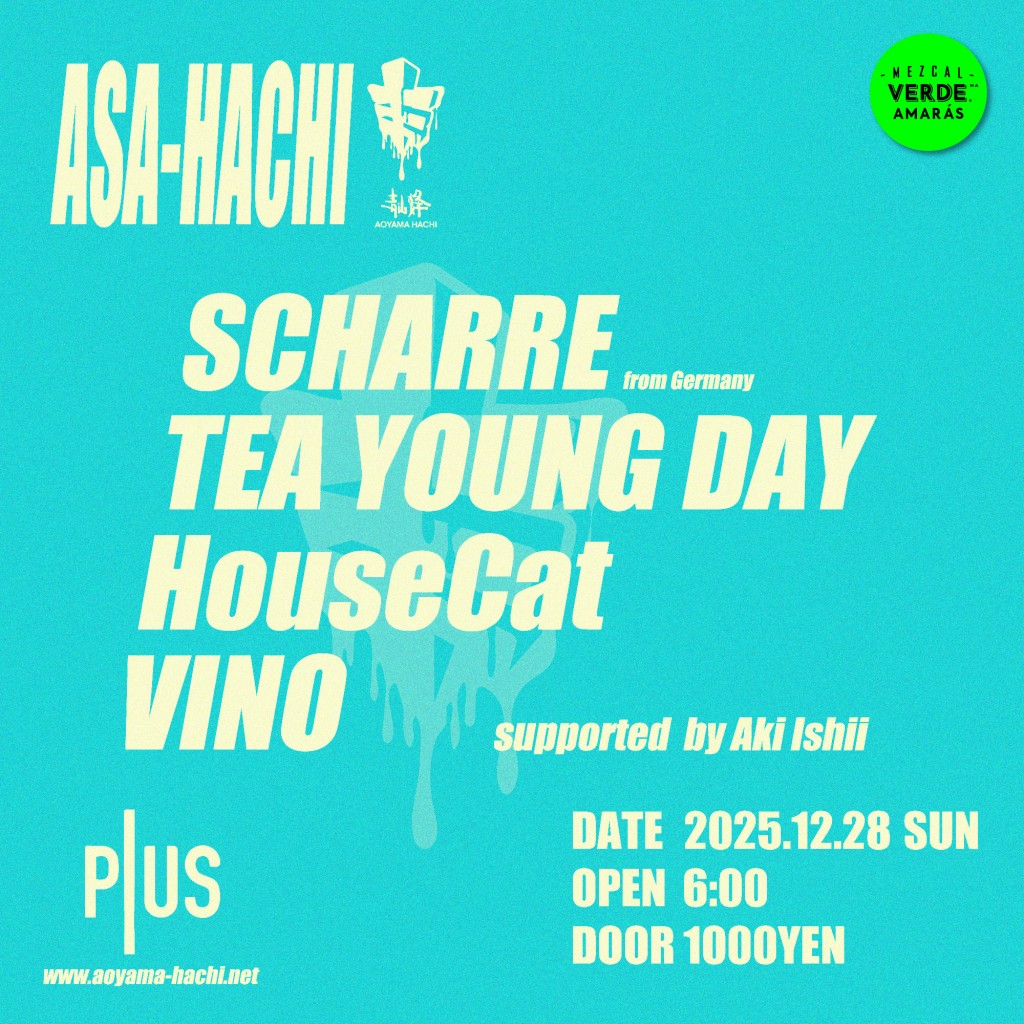 2025.12.28 Sun Asa-Hachi-Plus- Asa-Hachi-Plus- HOUSETECHNO DATE: 2025.12.28 Sun 06:00 DOOR: ¥1000 SCHARRE (from Germany) TEA YOUNG DAY HouseCat VINO supported by Aki Ishii