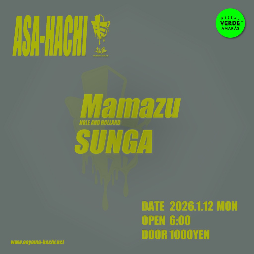2026.01.12 Mon Asa-Hachi Asa-Hachi HOUSETECHNO DATE: 2026.01.12 Mon 06:00 DOOR: ¥1000 Mamazu (HOLE AND HOLLAND) SUNGA