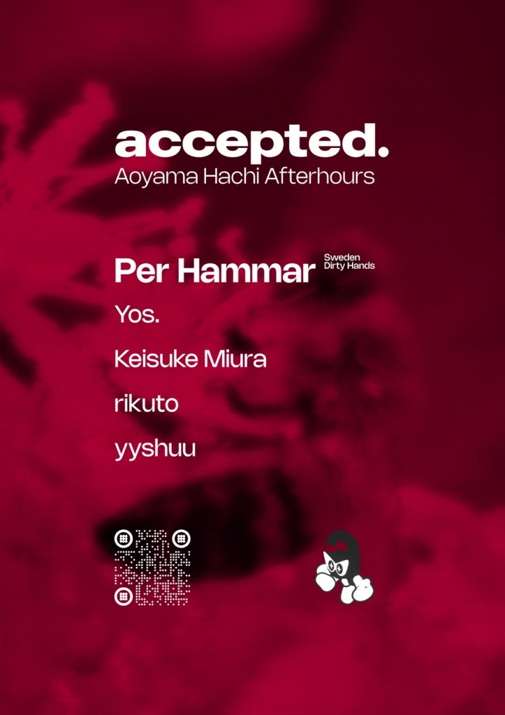 2025.10.10 Fri accepted. afterhours accepted. afterhours HOUSETECHNO DATE: 2025.10.10 Fri 06:00 DOOR: ¥1500 -2F- ■DJ Per Hammar (Sweden) Yos. yyshuu -3F- ■DJ rikuto Keisuke Miura
