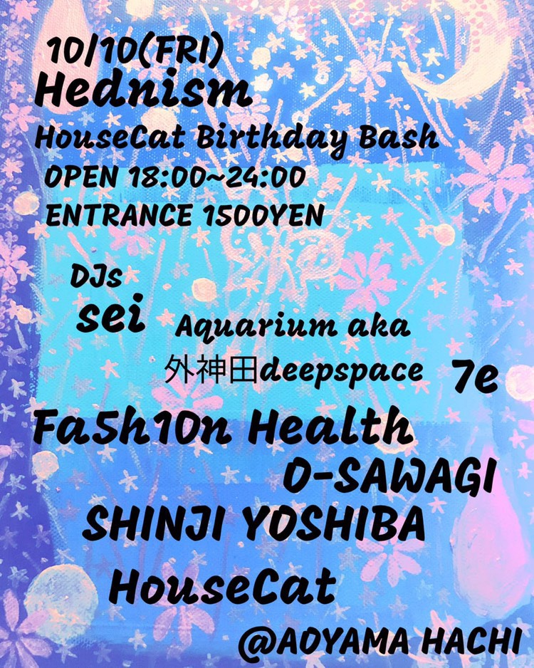 2025.10.10 Fri HEDNISM〜HouseCat Birthday Bash〜 HEDNISM〜HouseCat Birthday Bash〜 HOUSETECHNO DATE: 2025.10.10 Fri 18:00 DOOR: ¥1500 ■DJs sei Aquarium a.k.a 外神田deepspace 7e Fa5h10n Health O-SAWAGI SHINJI YOSHIBA feat RICA HouseCat