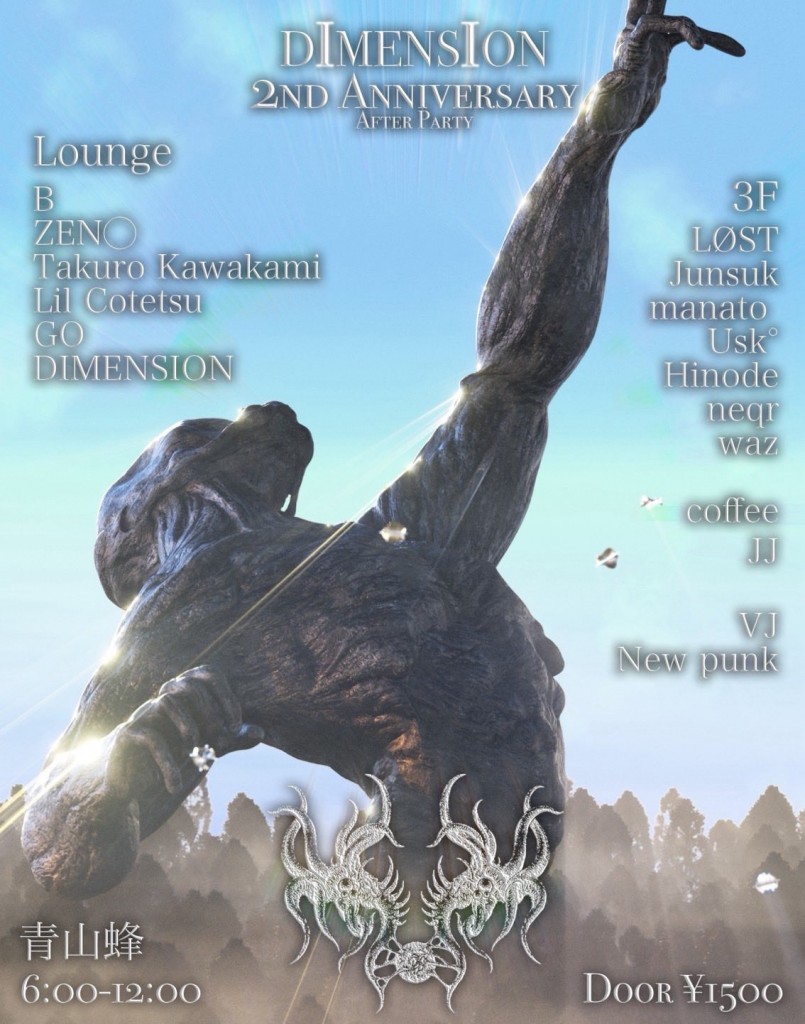 2025.11.08 Sat DIMENSION After Party DIMENSION After Party HOUSETECHNO DATE: 2025.11.08 Sat 06:00 DOOR: ¥1500 -2F- ■DJ B Zen◯ Takuro Kawakami Lil Cotetsu Go DIMENSION -3F- ■DJ LØST Junsuk manato Usk° Hinode neqr waz Coffee JJ
