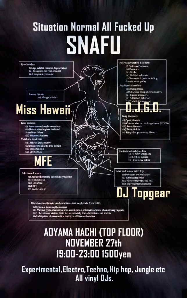 2025.11.27 Thu SNAFU SNAFU HOUSE DATE: 2025.11.27 Thu 19:00 DOOR: ¥1500 ■4F D.J.G.O. DJ Topgear MFE MISS HAWAII