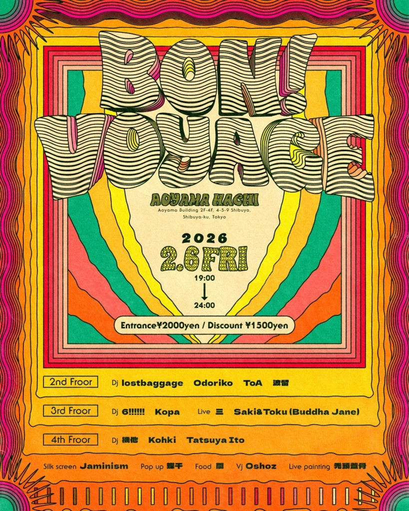 2026.02.06 Fri BON! VOYAGE BON! VOYAGE JAZZREGGAE DATE: 2026.02.06 Fri 19:00 DOOR: ¥2000 / DISCOUNT ¥1500 -3F- ■DJ KOPA 6!!!!!Dj’s ■LIVE Saki&Toku (Buddha Jane) 三 -4F- ■DJ Kohki 機他 Tatsuya ■SHOP 蝶千 Jaminism ■FOOD 間 ■VJ Oshoz ■LIVE PAINT 禿頭蓋骨