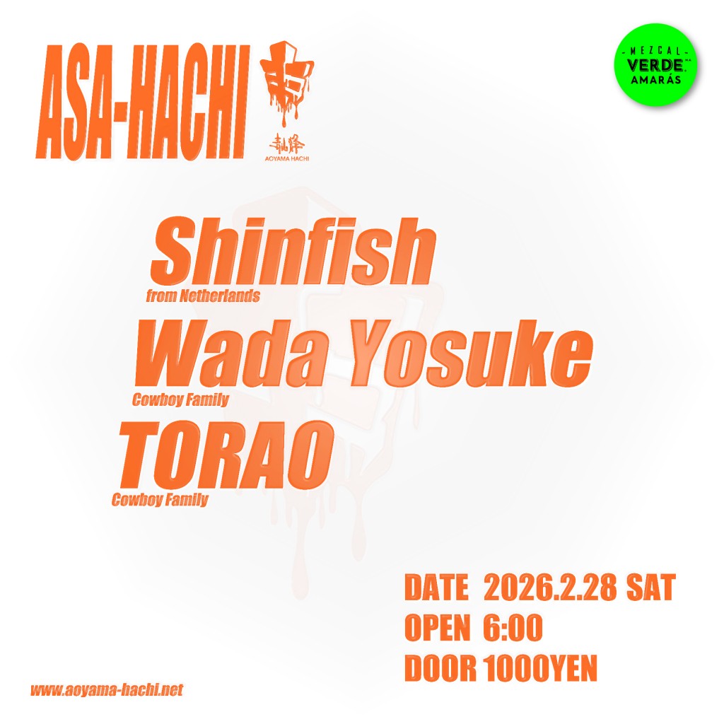 2026.02.28 Sat Asa-Hachi Asa-Hachi HOUSETECHNO DATE: 2026.02.28 Sat 06:00 DOOR: ¥1000 Shinfish (Netherlands) Wada Yosuke (Cowboy Family) TORAO (Cowboy Family)
