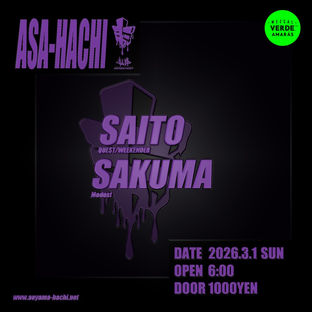 2026.03.01 Sun Asa-Hachi Asa-Hachi HOUSETECHNO DATE: 2026.03.01 Sun 06:00 DOOR: ¥1000 SAITO (QUEST/WEEKENDER) SAKUMA (Modest)