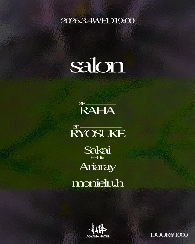 2026.03.04 Wed salon salon MINIMAL DATE: 2026.03.04 Wed 19:00 DOOR: ¥1000 -3F- ■DJ RAHA -2F- ■DJ RYOSUKE Sakai (HELlix) Ariaray monielu.h