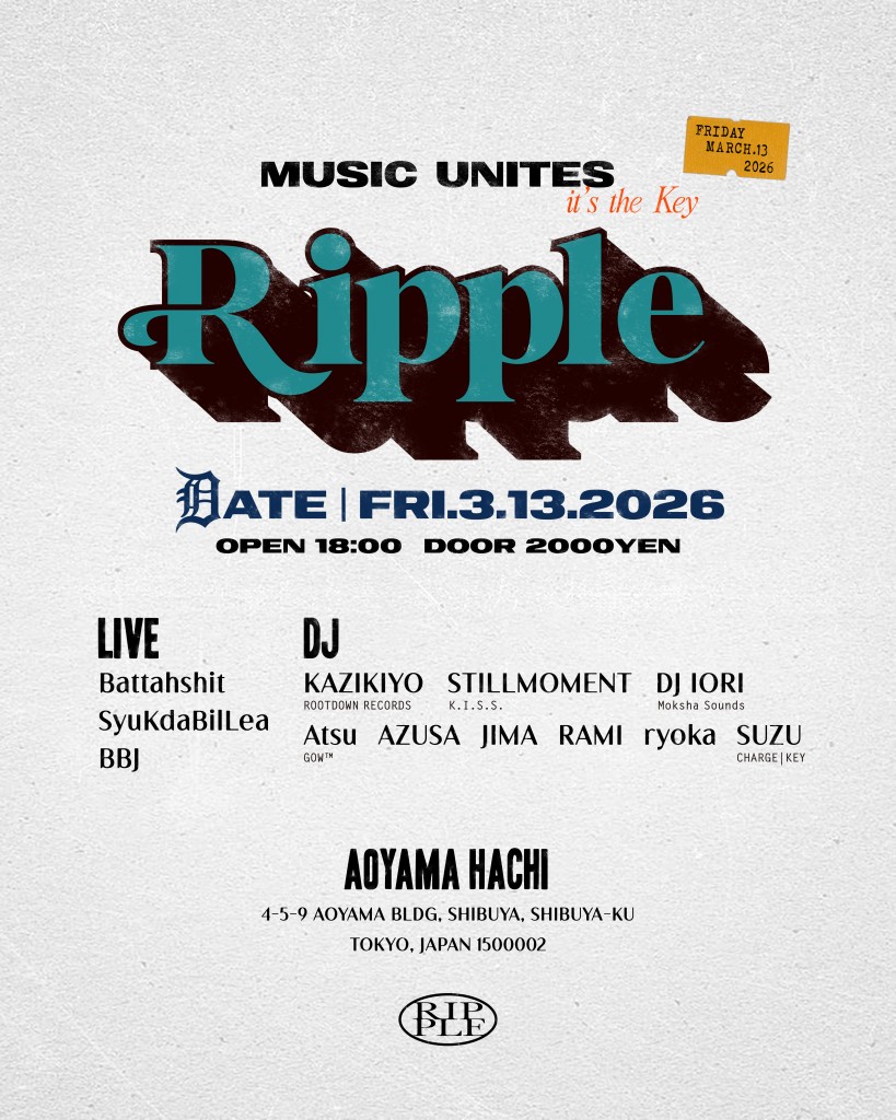2026.03.13 Fri Ripple Ripple HOUSEJAZZSOUL DATE: 2026.03.13 Fri 18:00 DOOR: ¥2000 ■LIVE Battahshit SyuKdaBilLea BBJ ■DJ KAZIKIYO (ROOTDOWN RECORDS) STILLMOMENT (K.I.S.S.) DJ IORI (Moksha Sounds) Atsu (Gow™) AZUSA JIMA RAMI ryoka SUZU