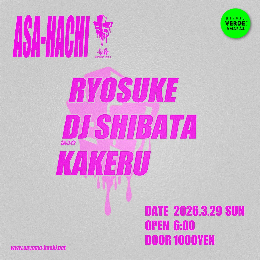 2026.03.29 Sun Asa-Hachi Asa-Hachi HOUSETECHNO DATE: 2026.03.29 Sun 06:00 DOOR: ¥1000 RYOSUKE DJ SHIBATA (探心音) KAKERU